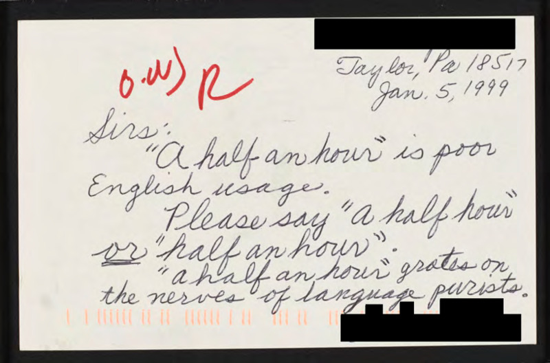 Registers their dislike of the term "a half an hour."