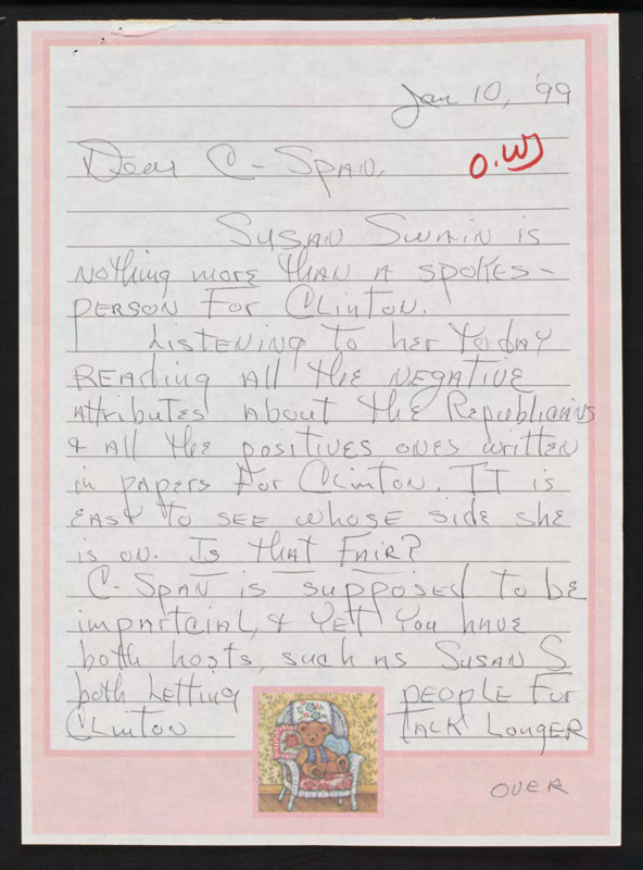 Accuses Susan Swain of bias toward Bill Clinton and gives examples where they feel this showed.