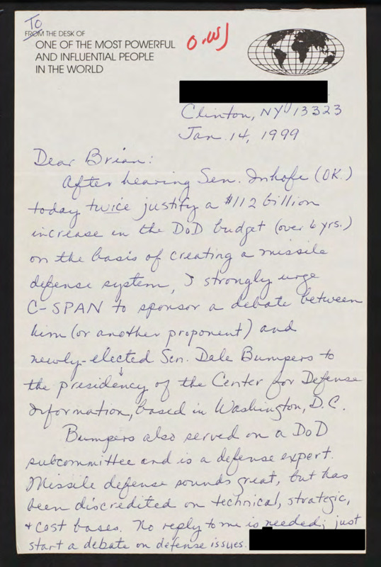 Suggests C-SPAN sponsor a debate regarding the increase of the budget for the Department of Defense.