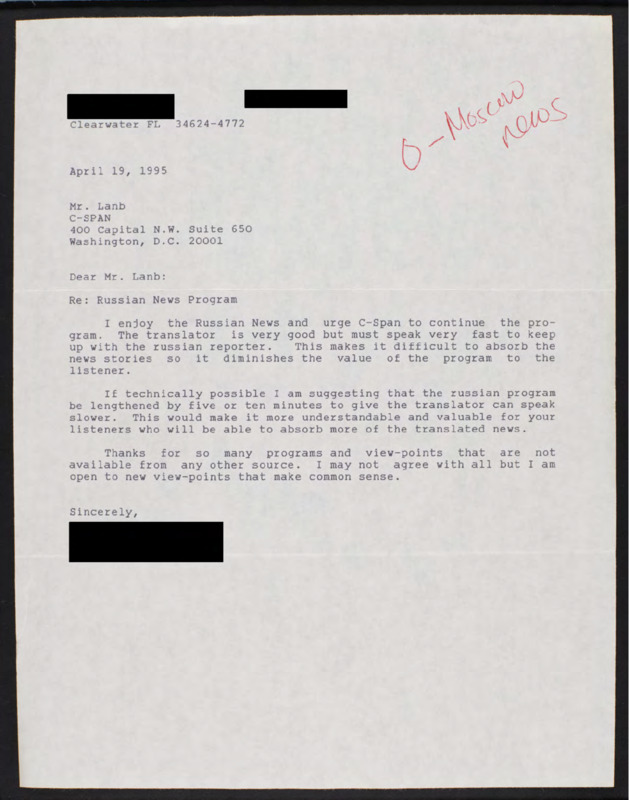 Encourages C-SPAN to continue airing Russian news but to improve the translation.
