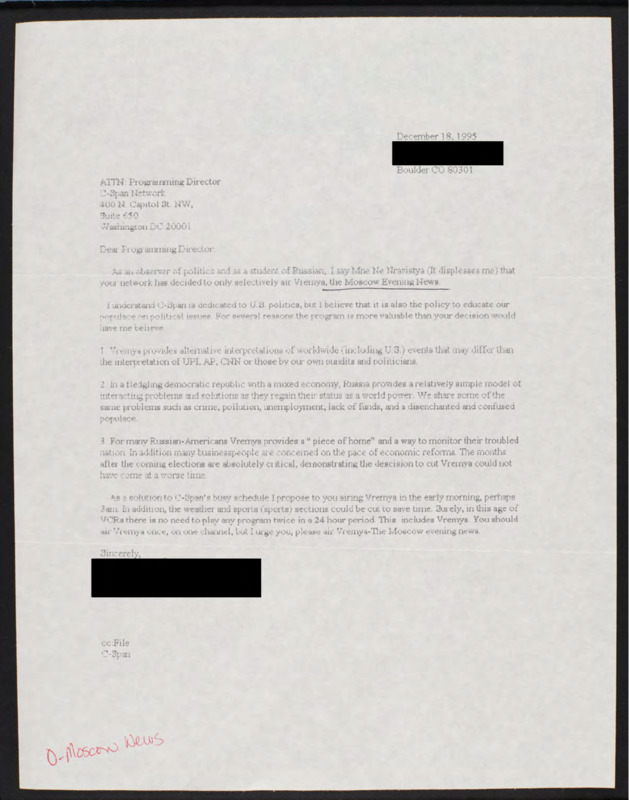 Letter to C-SPAN, 1995-12-18
