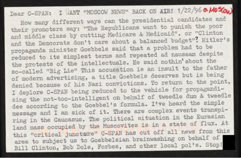 Complains about the political ads run by both parties and compares it to Nazi propaganda, then asks for the Moscow News back.