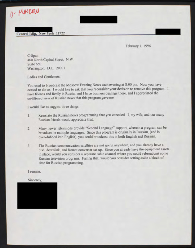 Suggests C-SPAN reinstate the broadcast of the Moscow Evening News with in multiple languages, and start broadcasting some Russian television shows as well.