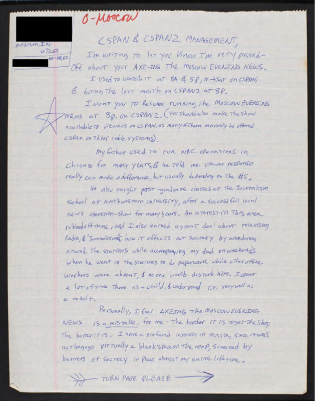 States anger that C-SPAN stopped airing the Moscow Evening News and asks them to resume broadcast, describes what they learned from their father, an NBC executive, and discusses the larger impact of television on the public.