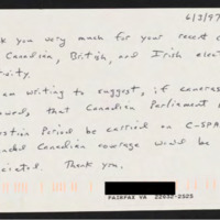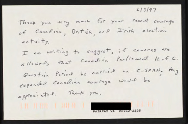 Thanks C-SPAN for their coverage of the British, Canadian, and Irish elections, then asks if more Canadian coverage can be shown.