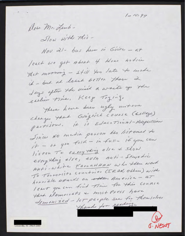 Laments missing the C-SPAN Bus in their town, then defends Newt Gingrich's college course as nonpartisan and criticizes C-SPAN and other news outlets for prioritizing extremists.