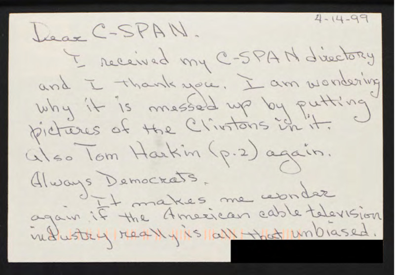 Thanks C-SPAN for the Congressional directory but wishes it didn't have the Clintons in it and wonders if C-SPAN is biased.