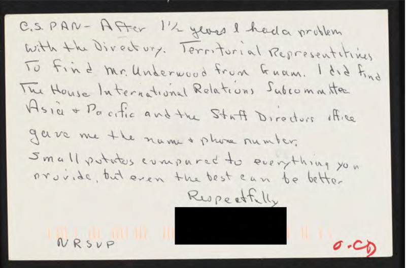 Recounts difficulty finding the names of territorial representatives for Guam and suggests C-SPAN improve this section of their Congressional directory.