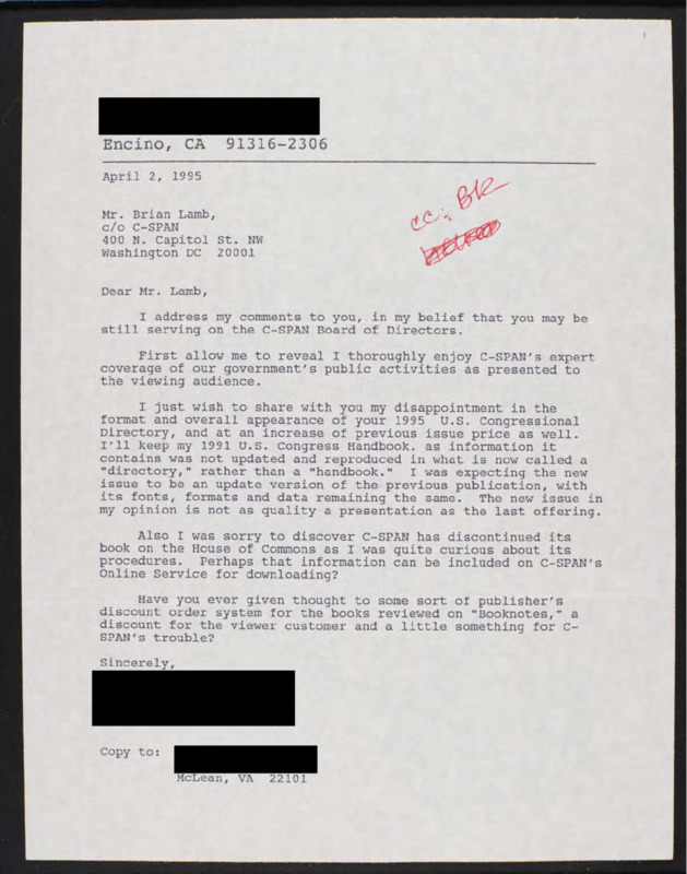 Letter to C-SPAN, 1995-04-02