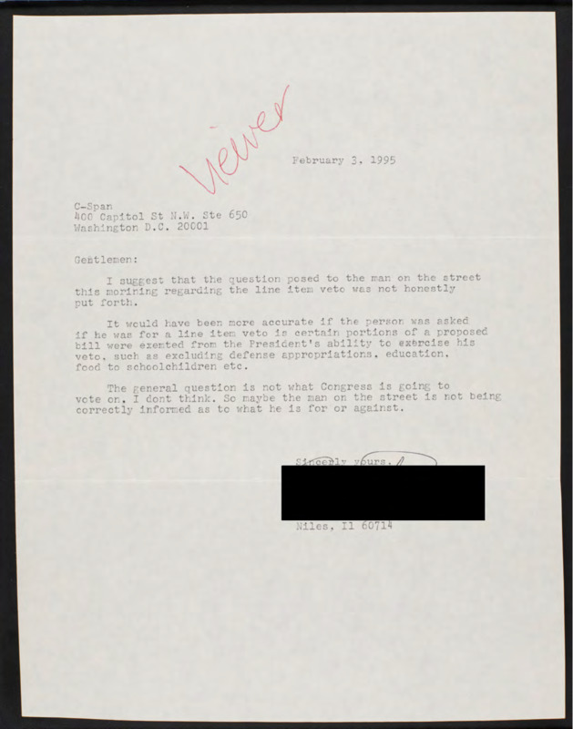 Responds to a comment made by a "man on the street" about line-item vetoes and feels the question was not accurately posed to the man.
