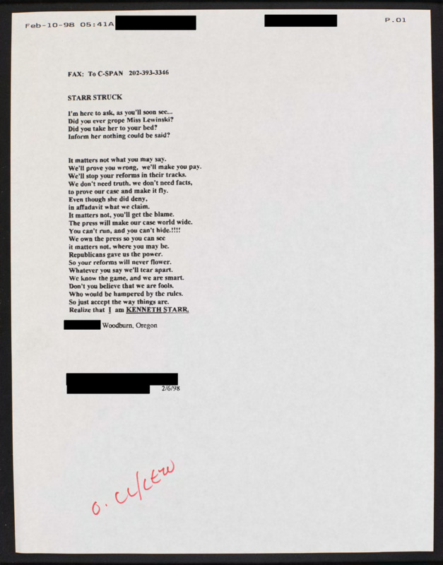 Encloses a poem about Ken Starr which describes Starr allegedly ignoring rules and facts in the Clinton investigation.