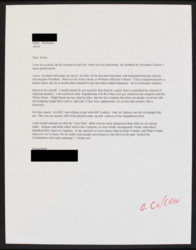 Believes that Bill Clinton is his own worst enemy but states they'd rather support him than the Republicans, citing Iran-Contra as an example of why.