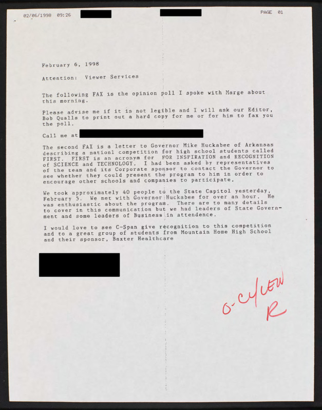 Encloses a fax of a poll claiming most people do not believe Bill Clinton, then mentions an academic program for high school students they hope C-SPAN will publicize.