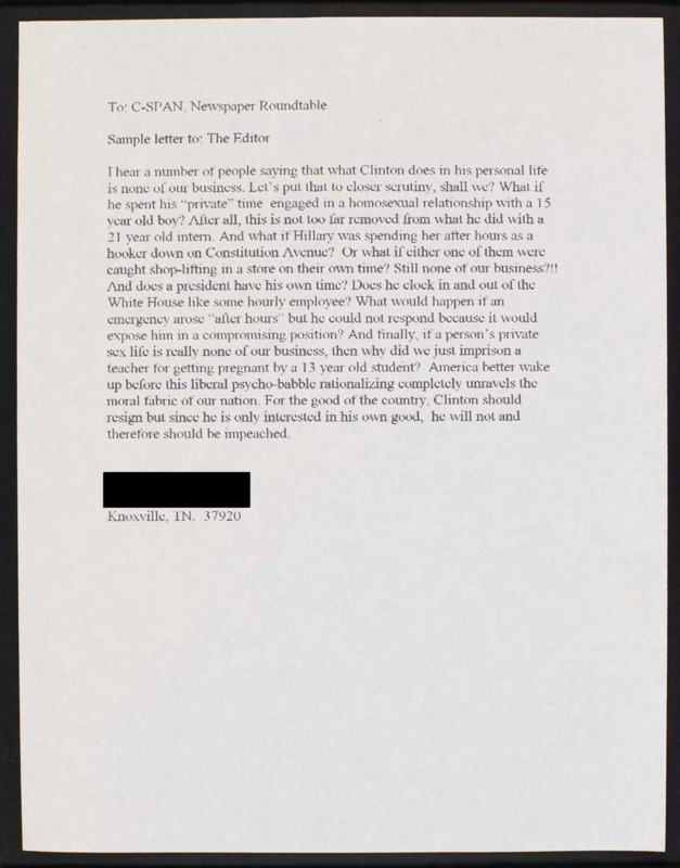 Argues that what Bill Clinton does in his personal life should interest the people and states belief that Clinton should be impeached.