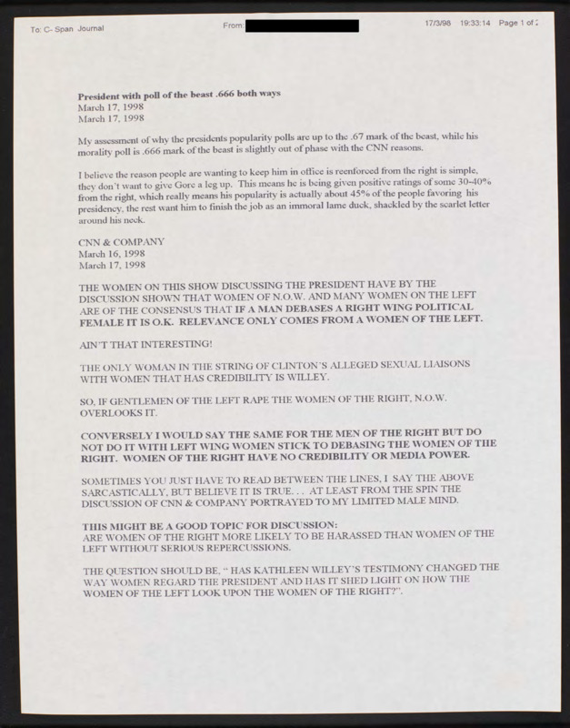 Argues that Bill Clinton is morally corrupt and wonders if some women are more likely to be harassed without consequence; discusses public polls of Clinton.