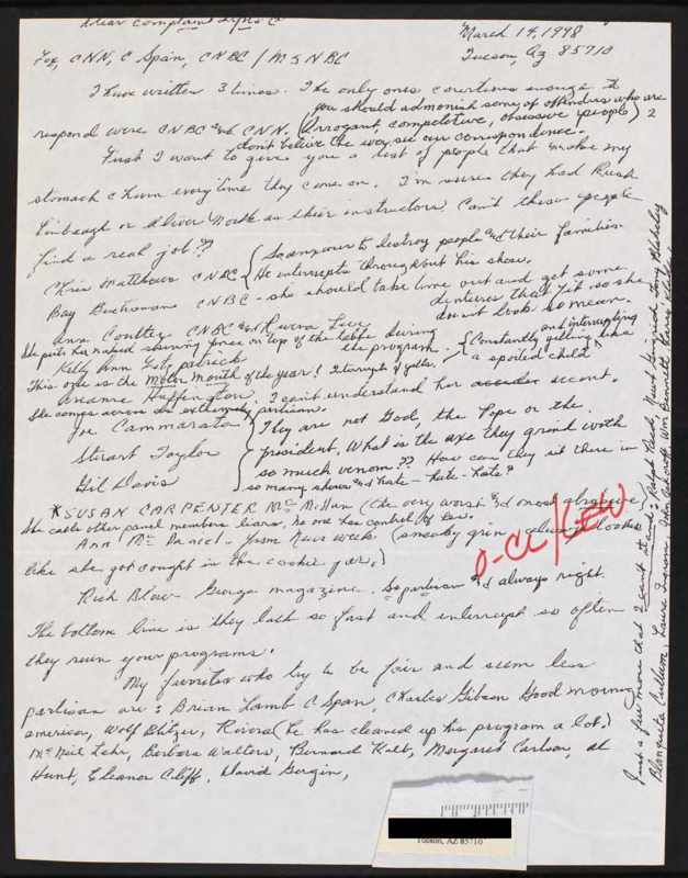 Lists the reporters they do not like and includes that they enjoy Brian Lamb's coverage of the news.