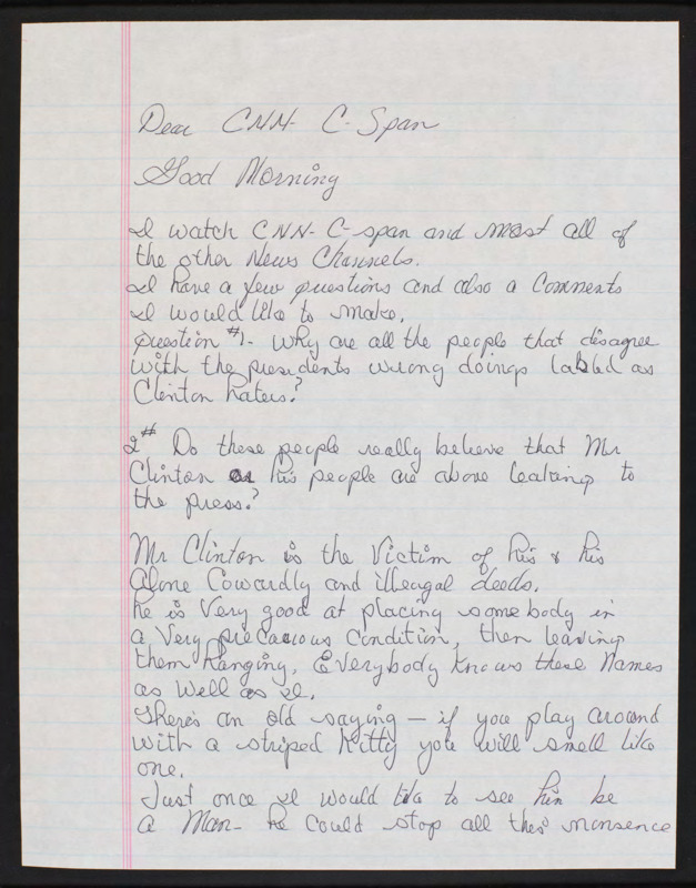 Questions people's support of Bill Clinton, gives their opinion that Bill Clinton is a liar, states that they did not vote for him, and expresses a desire to see more people opposed to Clinton represented in the news.