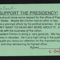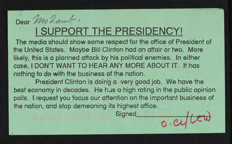 Encloses a postcard stating support for Bill Clinton and frustration with frequent coverage of the investigation.