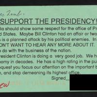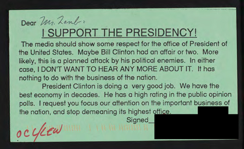 Encloses a postcard stating support for Bill Clinton and frustration with frequent coverage of the investigation.