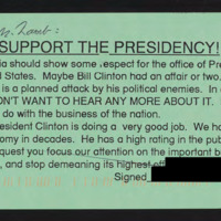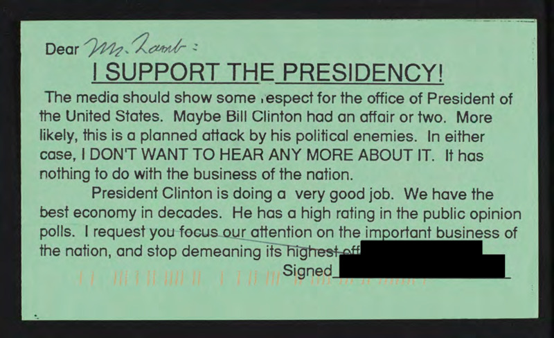 Encloses a postcard stating support for Bill Clinton and frustration with frequent coverage of the investigation.