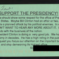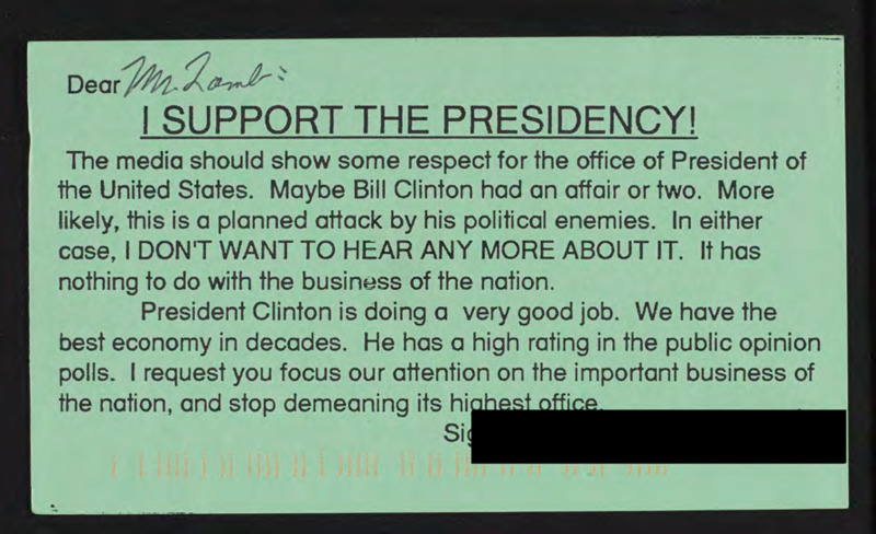 Encloses a postcard stating support for Bill Clinton and frustration with frequent coverage of the investigation.