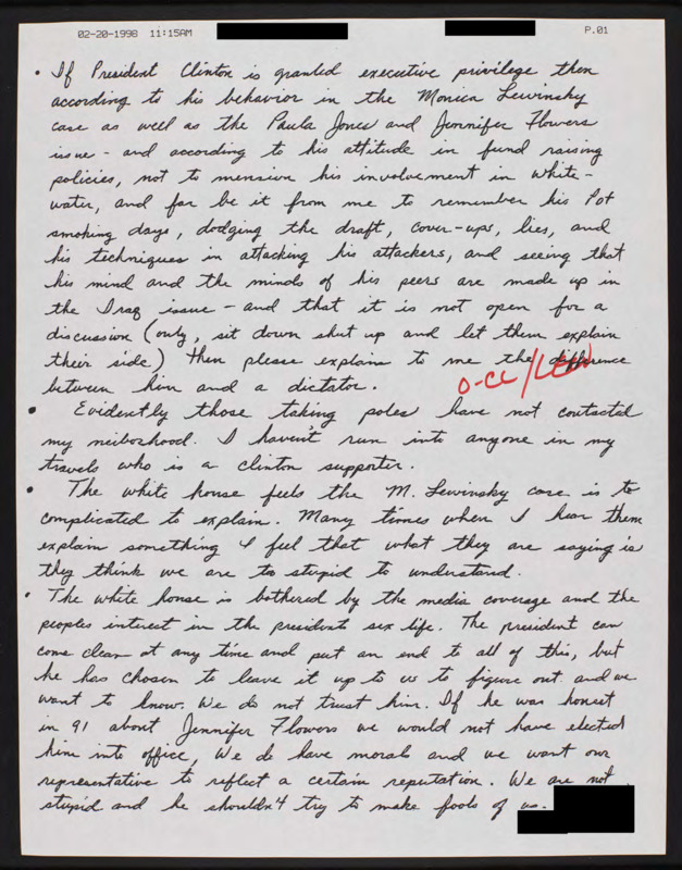 Expresses dislike for Bill Clinton, calls Clinton a dictator, and states dislike for the public opinion polls supporting Clinton and the news from the White House.