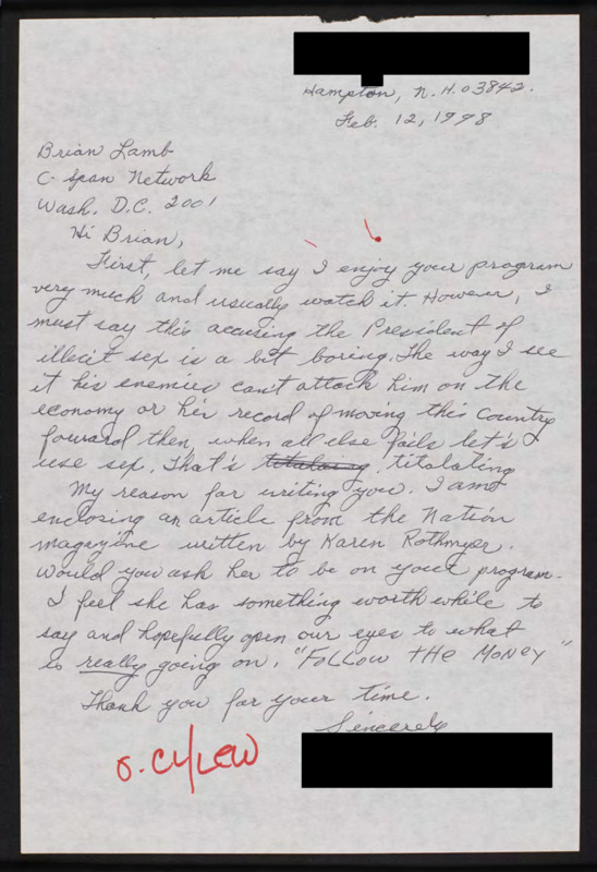 States frustration that Bill Clinton's sexual history is being used to undermine him and believes it is because his enemies cannot attack him on his policies, then suggests a guest for C-SPAN.