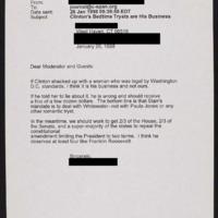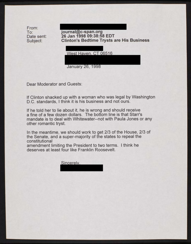 Believes Bill Clinton's sexual standards are his business and that he should receive a small punishment for lying about it, but that he should be elected to at least four terms as President.