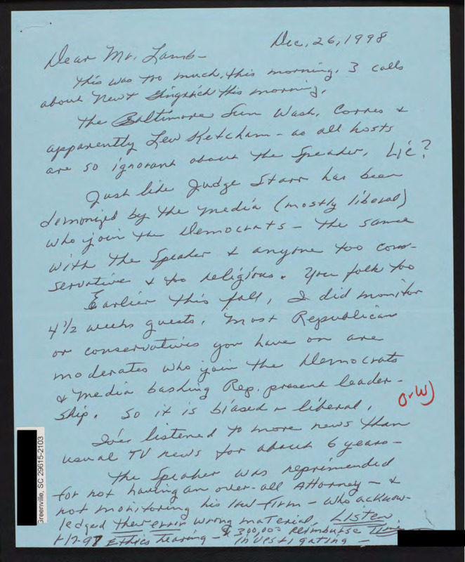 Accuses C-SPAN of bias towards liberals because they allowed calls critical of Newt Gingrich.