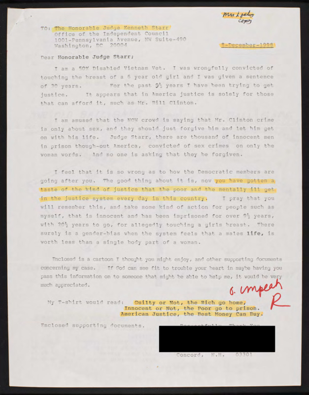 Writes to Ken Starr to defend him, writes of his own conviction of sexual crimes, and states belief that there is gender-biased against males in the justice system.