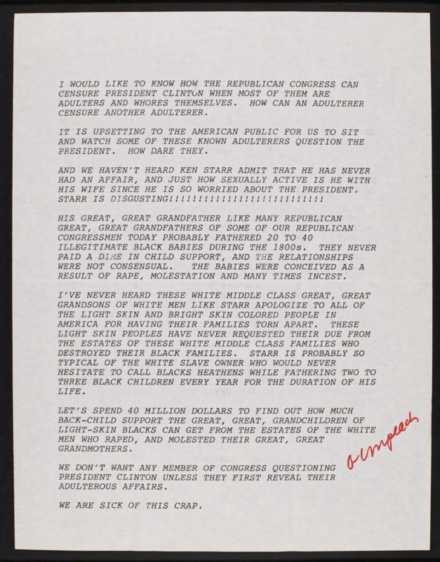 Complains that the people censuring Bill Clinton are also alleged adulterers and relates idea that the ancestors of the white middle class fathered Black children but never paid support for them.