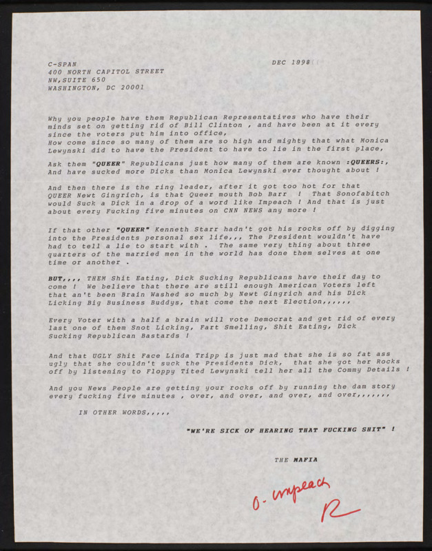 Asks why Republicans have their minds set on getting rid of Bill Clinton, then accuses many of them of being gay and levels explicit insults at various people accusing Bill Clinton.