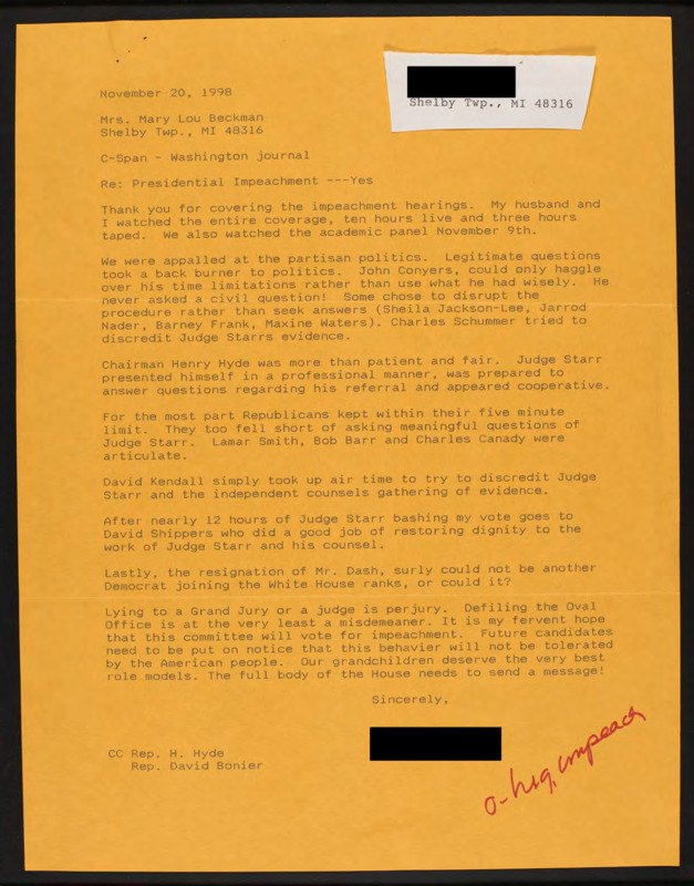 Describes their impressions watching the impeachment proceedings, resulting in favoring the Republicans and states opinion that Bill Clinton should be impeached.