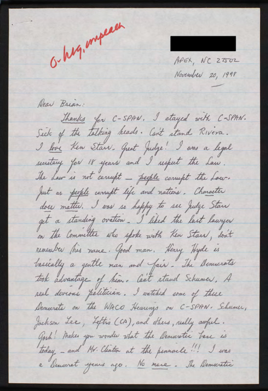 Thanks C-SPAN, states positive impressions of Republicans at the Clinton hearings, and describes why they are no longer a Democrat.