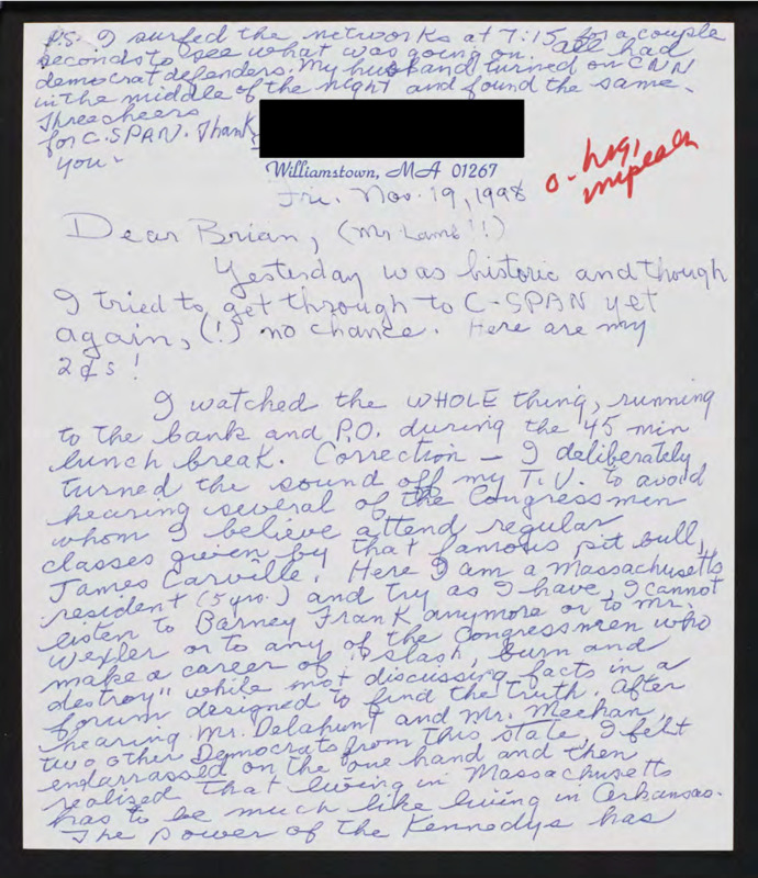 Reacts to several people who appeared in the hearings, states positive impressions of Ken Starr, and expresses a desire to get involved in Republican politics.