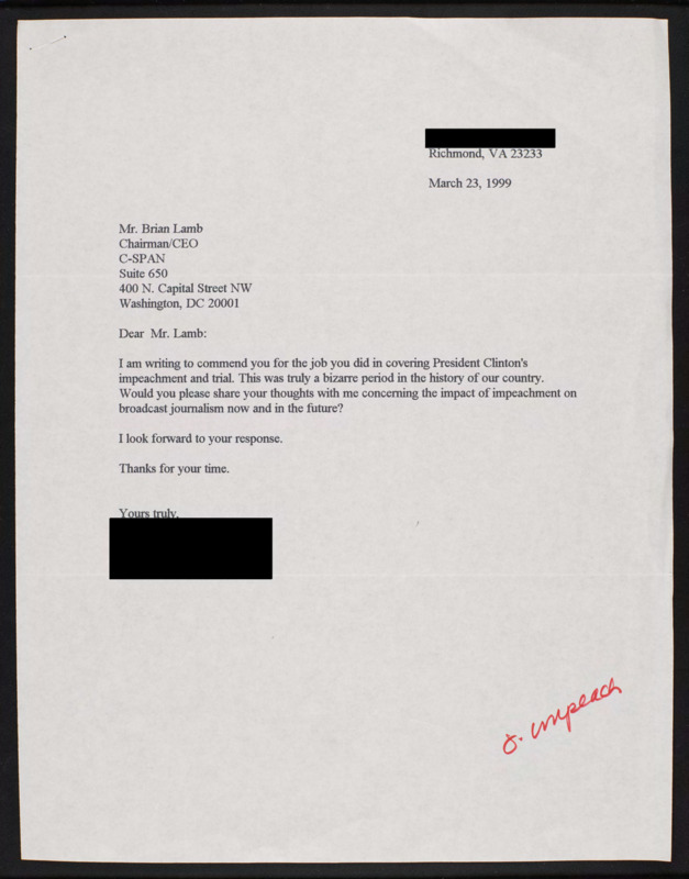 Commends C-SPAN for their coverage of the impeachment and asks to hear how C-SPAN feels the impeachment will impact journalism moving forward.