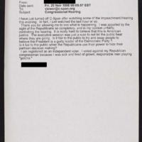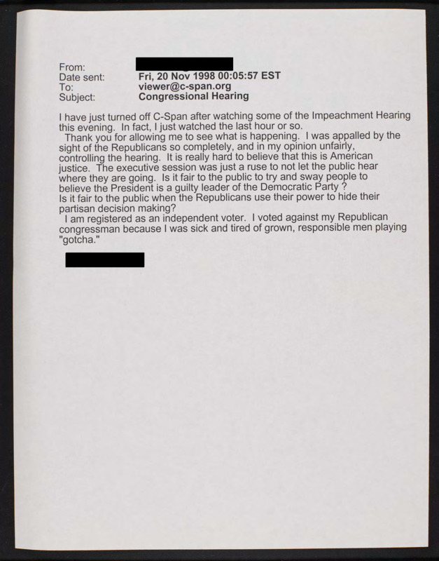 Thanks C-SPAN for airing the impeachment hearings and expresses dislike of Republican representatives leading the hearing.