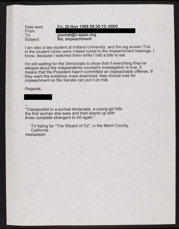Believes Bill Clinton should be impeached so that the evidence against him can be thoroughly examined.