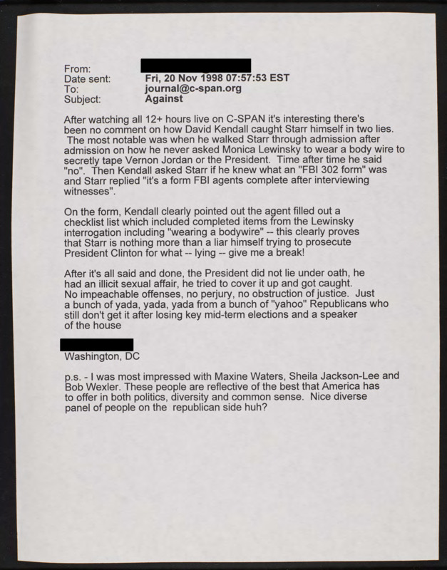 Letter to C-SPAN, 1998-11-20
