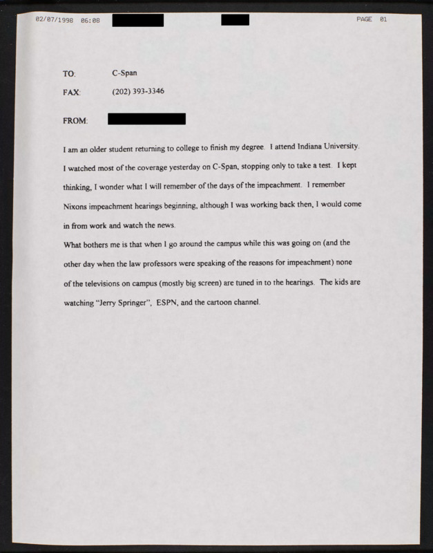 Describes watching the impeachment hearings on Indiana University campus and expresses shock that other students weren't watching.
