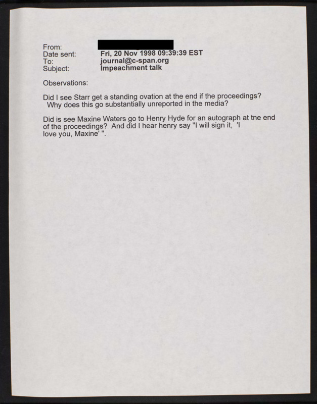 Asks why it wasn't reported that Ken Starr got a standing ovation and asks if Maxine Waters asked for Henry Hyde's autograph.