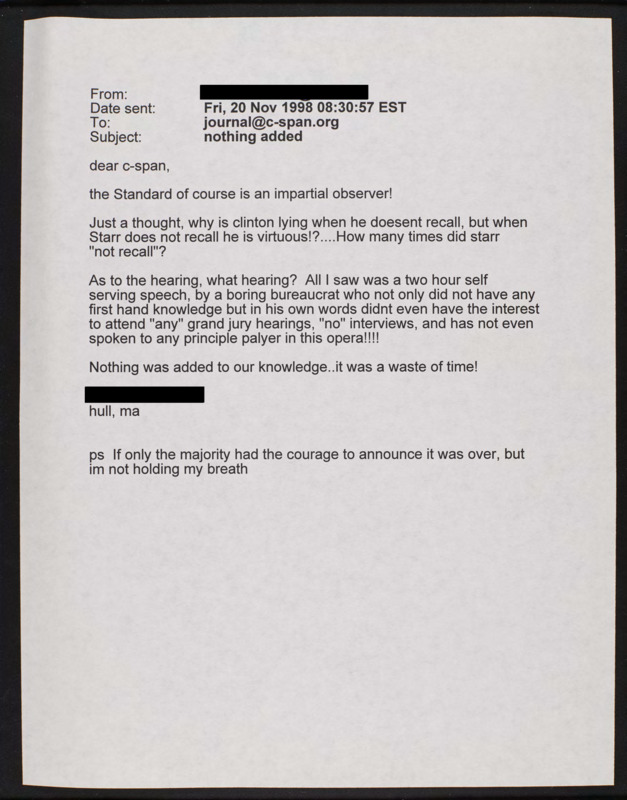 Criticizes Ken Starr, calling him boring and accusing him of lying.