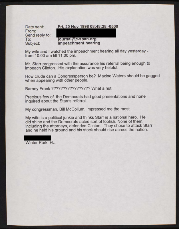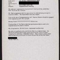 Recounts watching coverage of the impeachment hearings, praises Ken Starr, and criticizes the Democrats.
