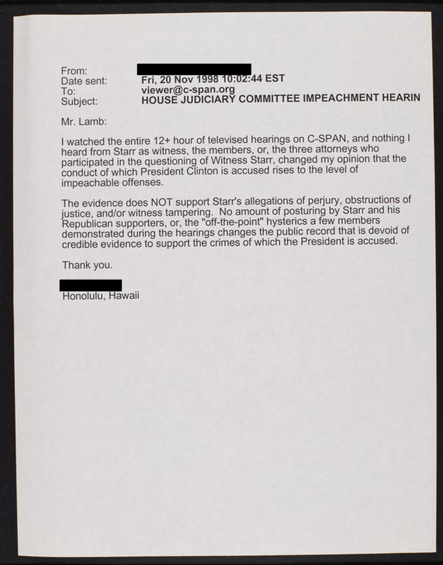 Reports watching all of the impeachment hearings and concludes that Bill Clinton's crimes are not impeachable offenses.