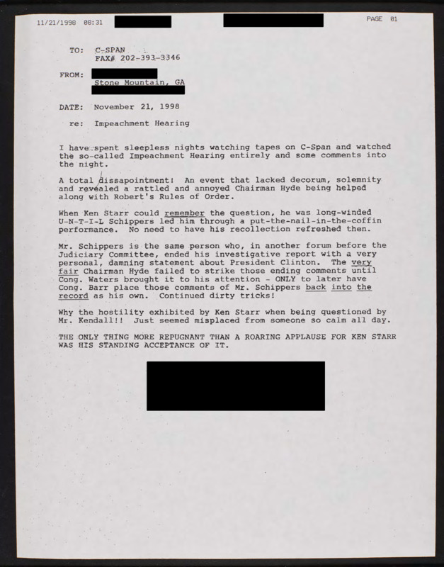 Responds to coverage of the impeachment hearings by expressing disappointment in several of the prominent figures, including Ken Starr and Henry Hyde.
