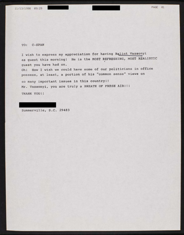Thanks C-SPAN for having a particular guest on, stating that he was refreshing.