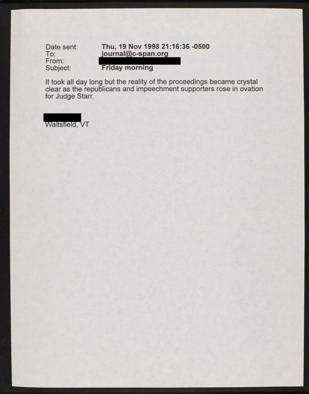Believes the ovation of Ken Starr summarized the events of the impeachment hearings.