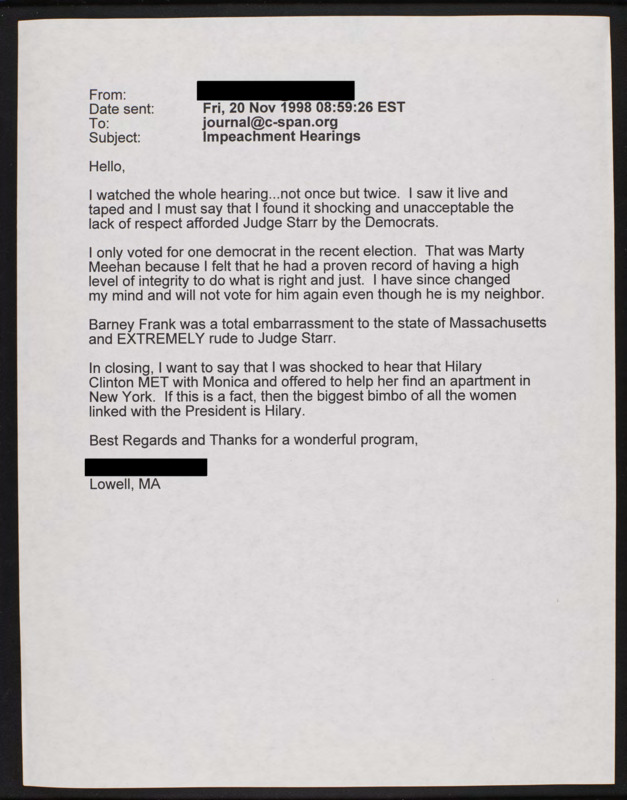 Criticizes the Democrats treatment of Ken Starr and calls Hillary Clinton a bimbo.