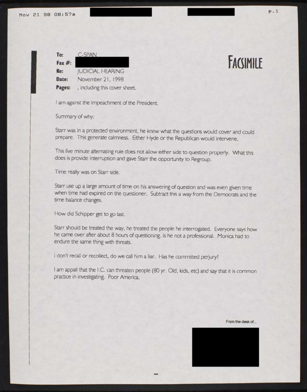 Opposes the impeachment of Bill Clinton and summarizes why.