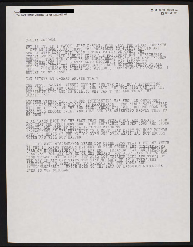 Questions the bias of different news organizations in their discussion of impeachment, describes why they feel impeachment is a necessity, and offers their interpretation of the word "misdemeanor."